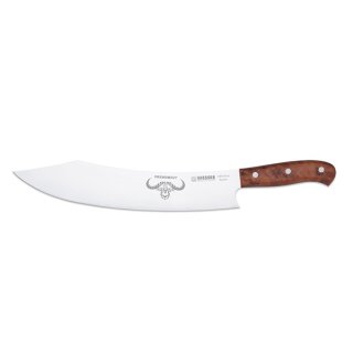 Die Klingenform der PremiumCut Barbecue No.1 Thuja von Giesser erinnert an eine Machete und weckt die Urinstinkte des Benutzers. Die Griffschalen sind aus sehr altem und besonders widerstandsfähigem Thuja-Wurzelholz gefertigt. Thuja wird oft auch als Lebensbaum bezeichnet. Und so sind auch die Griffe - Jeder Griff hat eine ganz besondere Maserung und außergewöhnliche Schönheit. So entsteht ein warmes und sicheres Griffgefühl. Das Messer liegt sicher und perfekt in der Hand. So wird premiumCut zu einer ganz besonderen Messerserie, die Tradition und höchste Perfektion verbindet. Messer für höchste Ansprüche. Die spitz geschwungene lange Klinge ist bestens geeignet zum Schneiden großer Fleischstücke, aber auch für Fisch und Gemüse. Das besondere Schärf-und Polierverfahren sorgt für eine außergewöhnliche Schärfe. Die Griffgestaltung ist ergonomisch vollkommen. Die messerführende Hand findet automatisch ihre sichere Position in der besonders ausgeprägten Griffmulde und garantiert so dem Anwender die perfekte und kraftsparende Nutzung des Messers. Auch beim Kleinschneiden und Wiegen von Kräutern und Gemüse erweist sich diese besondere Eigenschaft als perfekter Beitrag zum präzisen und sicheren Schneiden.